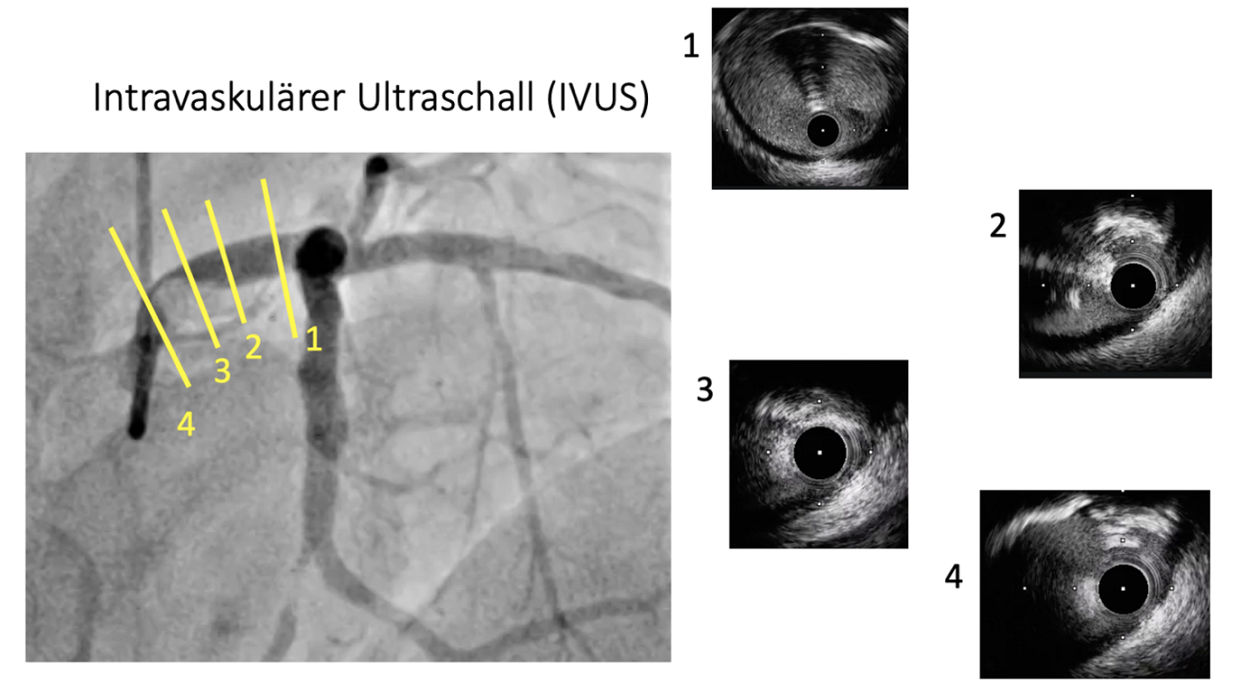 - Intravaskulärer Ultraschall (IVUS): hier wird die Engstelle, die Ablagerung selbst (Plaque) und deren Zusammensetzung sowie auch die Gefäßwand dargestellt; zudem können Gefäßdurchmesser und Länge der Gefäßverengung direkt vermessen werden