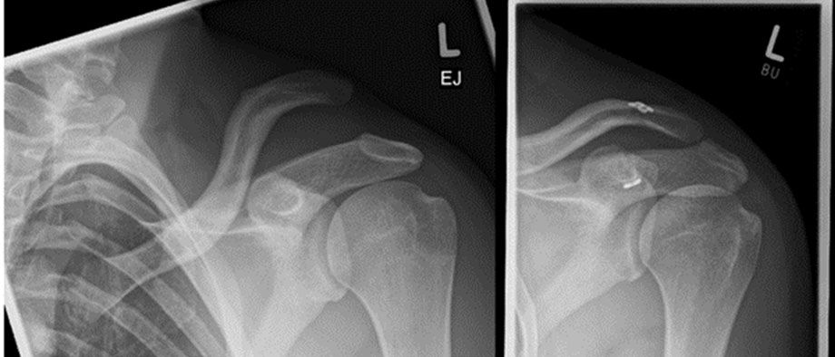 Linkes Bild: Schlüsselbeinhochstand, sogenanntes Klaviertastenphänomen. Die stabilisierenden Bänder sind gerissen. Rechtes Bild: nach arthroskopischen Einbringen von 2 „Dogbone buttons“ sind die anatomischen Verhältnisse wieder hergestellt. Der Hochstand des Schlüsselbeins ist aufgehoben. Bis die körpereigenen Bänder wieder verheilt sind schützt das flaschenzugähnliche Konstrukt zwischen den zwei Metallplättchen die körpereigenen Bänder vor Belastung und übernimmt deren Funktion.