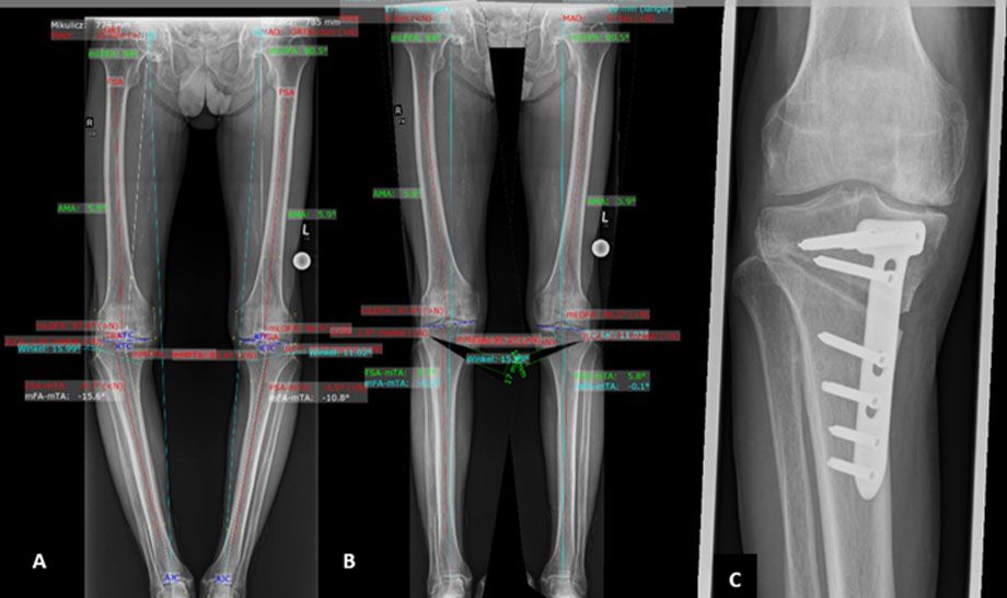 Auf dem Bild A ist die Ausgangssituation mit den O-Beinen beidseits dargestellt. Auf dem Bild B das geplante Operations-Ergebnis mit den geraden Beinachsen. Bild C: Operationsergebnis mit Osteotomie und Plattenversorgung. Die Knochenlücke füllt sich rasch mit neuem Knochen auf.